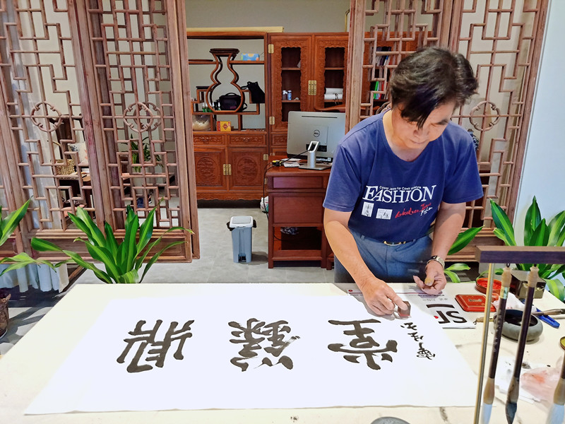 他癡心書藝五十余載,揮毫潑墨至今,仍筆耕不輟,足見其充沛的藝術(shù)激情和造詣。他心態(tài)平和,從不自矜 。在他身上更多地承續(xù)了古代文人的雅致情懷。觀其書法之象,有偃有仰,有欹有側(cè),修短合度,剛?cè)嵯酀?jì)。書道妙在性情,劉熙載《藝概•書概》云:“筆性墨情,皆以其人之性情為本。”他把心中對美的那份追求和意緒發(fā)抒于筆墨之間,一點一畫自有寬博雅正之氣,與其沉穩(wěn)、率直、純厚的“人品” 相互輝映。